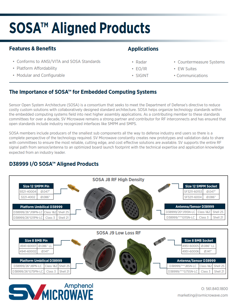 SV Microwave has been a member of SOSA since 2018, and actively participates and contributes to the VITA 67 and 66 spec. With VITA 67.3, SV continues to increase RF density and bandwidth, while shrinking the overall footprint of a design. SV Microwave proudly offers three RF series within the VITA 67.3 specification, SMPM, SMPS and most recently, NanoRF. Our VITA 66.5 product line achieves further density by combining RF and optical links within the same connector module.